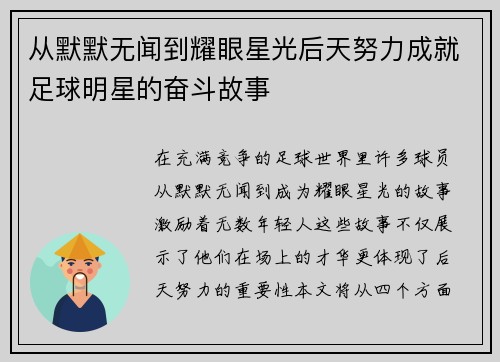 姚明,这位中国篮球的标志性人物,不仅因其卓越的球技而广为人知,同时他脸上那颗眼角的痣也成为了许多故事与传说的源泉。这颗痣并非单纯的外貌特征,而是姚明奋斗与坚持精神的象征。通过对这颗痣背后故事的深入探讨,我们可以看到姚明在职业生涯中所经历的艰辛、挑战以及他如何克服困难,最终实现自我价值和梦想。本文将从四个方面详细阐述姚明眼角痣背后的奋斗与坚持精神,探讨其对个人成长和职业发展的深远影响。 1、成长环...